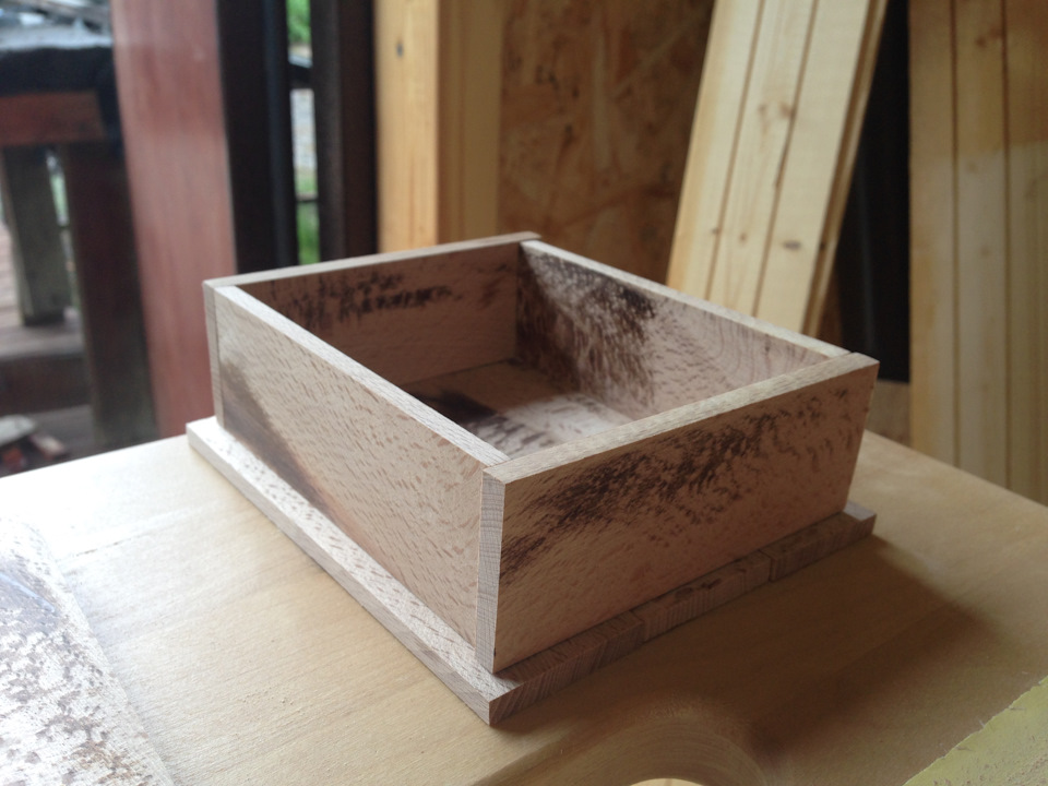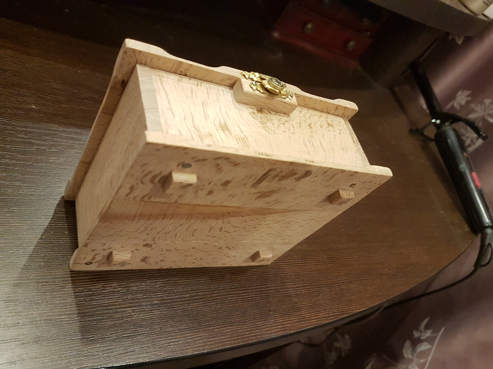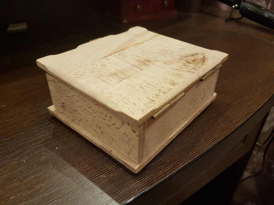 Квадратная и угловатая — она не смотрелась как шкатулка. Грав.машинкой снял грани, но не полностью, а оставил уголки (так показалось эстетичнее). Подравнял мелкой шкуркой и усё.