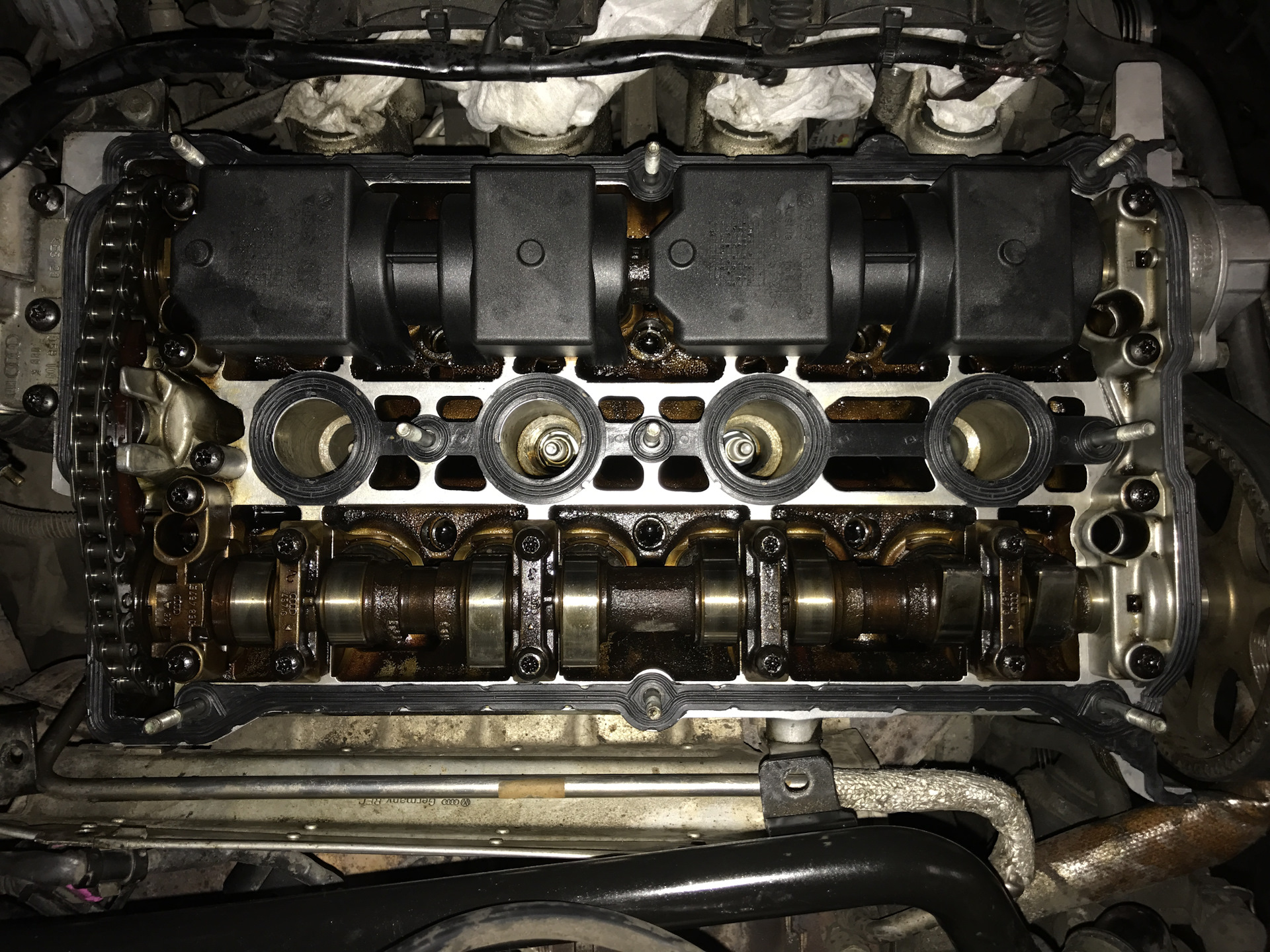 Протекал сальник впускного распредвала и прокладка клапанной крышки сопливила в свечные колодцы и наружу.