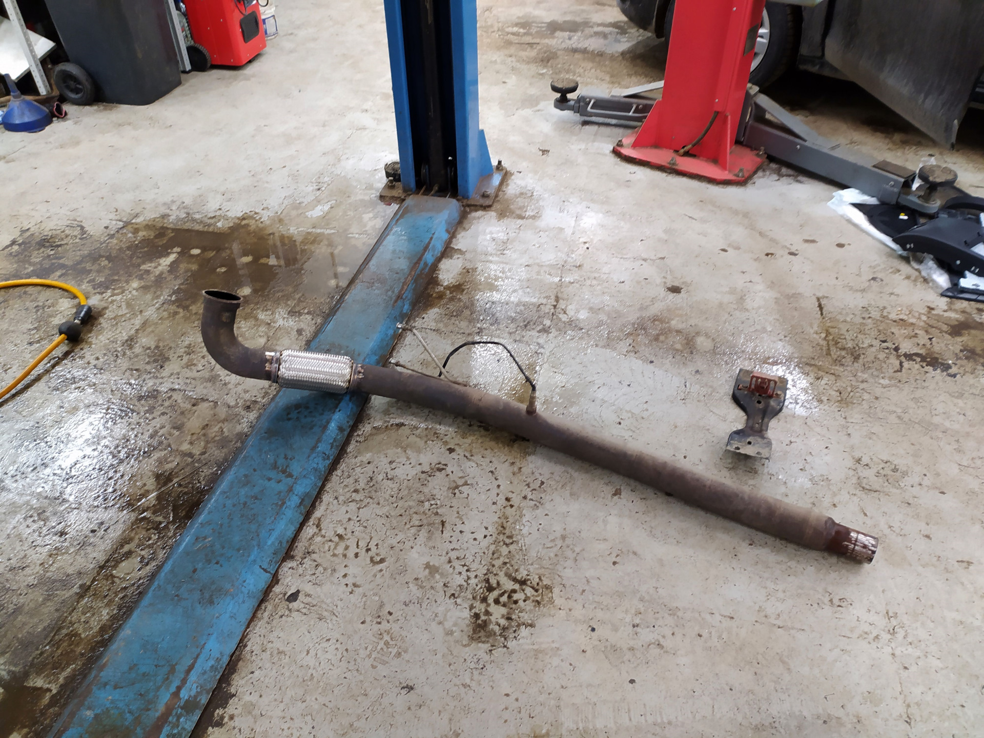 Продолжаю поиски постороннего звука при динамичном разгоне. Увидел, что верхний слой гофры сгнил и отвалился, надо бы заменить. Оставшиеся два слоя, как оказалось, нормальные, можно было и не менять. Предположил, что звук может появляется из-за вибрации, но чуда не произошло. Замерил размер гофры на родном downpipe c катализаторами — 200 мм, такой длины и купил. Оказалось, что на моем custom 3" downpipe стояла 150 мм. Ничего страшного, больше не меньше :)
