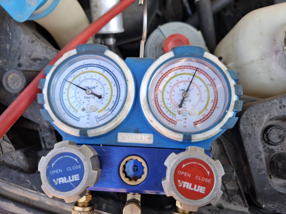 Я заметил что в при +30 на улице давление фреона в системе хорошее и хорошо холодит а при +40+45 давление ниже и на холостом дует тёплым, но при этом если полить водой на радиатор кондиционера охладить его то сразу начинает дуть холодным но это не надолго в пробках